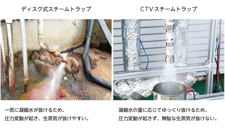 蒸気の漏れロスが少ないため、CTVスチームトラップに交換することで